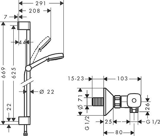 душевая лейка, душевая штанга, смеситель, шланг для душа