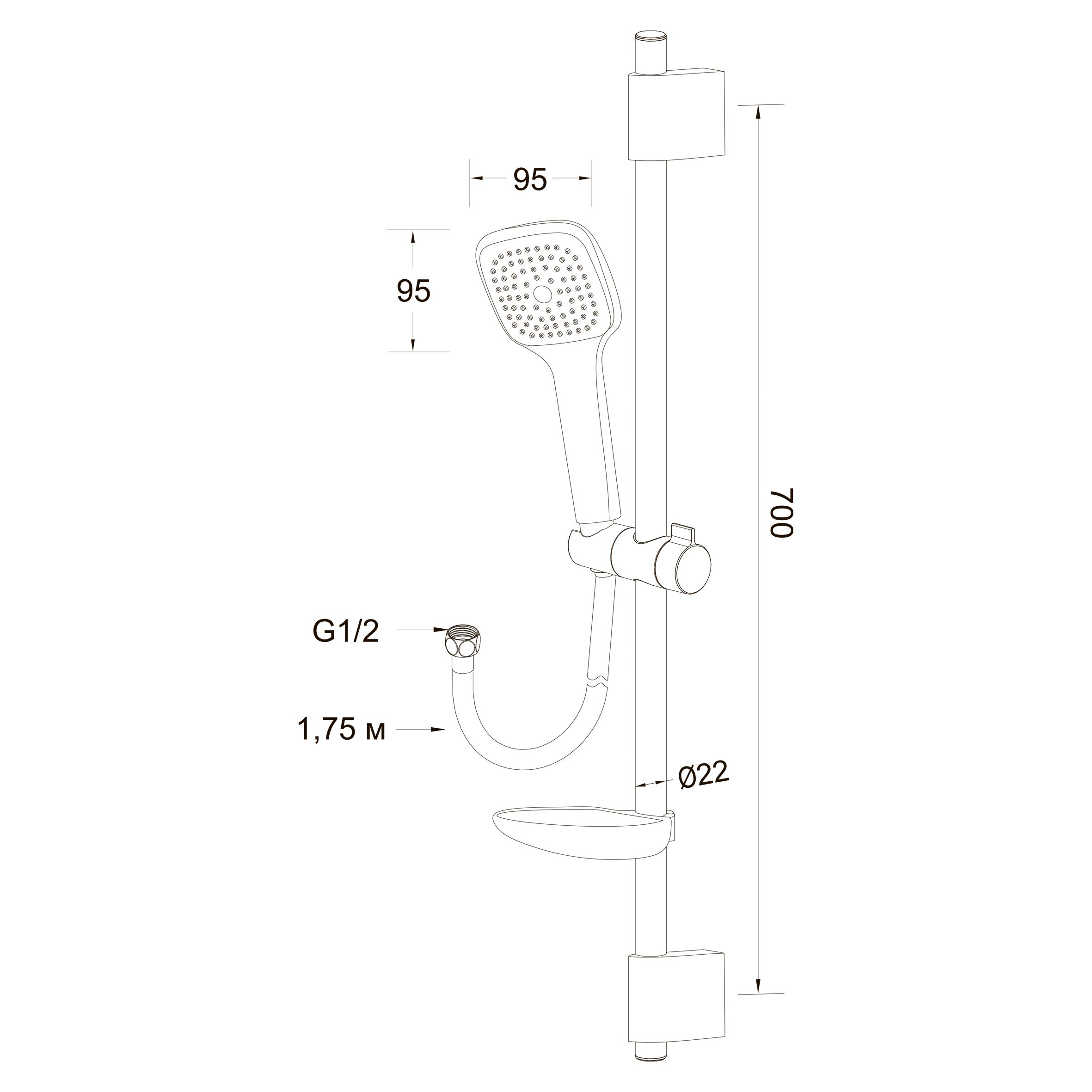 Российская торговая марка Pura Latuno это - смесители и душевые системы, разработанные согласно всем требованиям российских эксплуатационных условий. Душевой комплект: лейка однорежимная 95х95 мм с самоочищающимися форсунками, стальная штанга 700 мм, шланг металлический 1,75 м, мыльница и держатель из хромированного ABS-пластика.