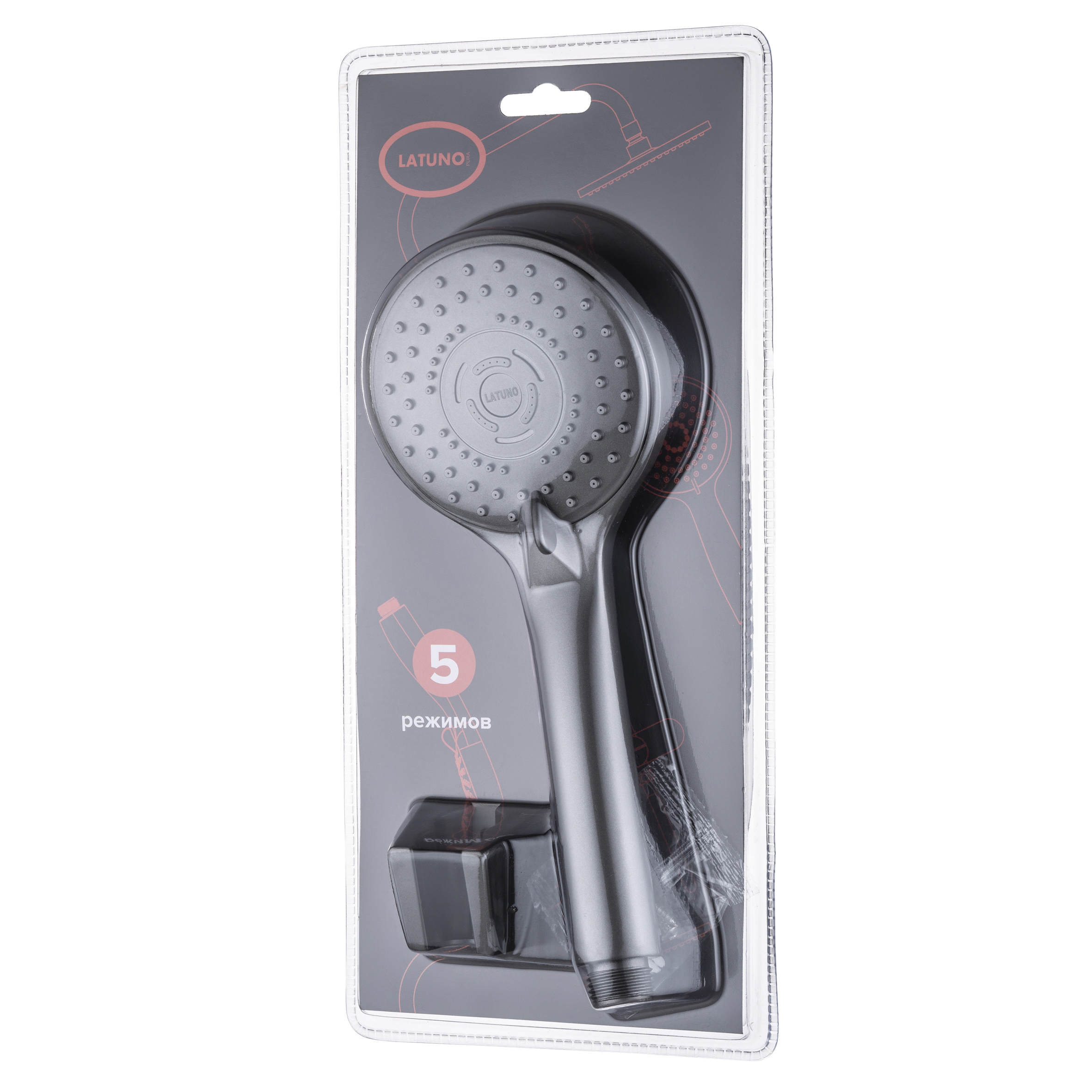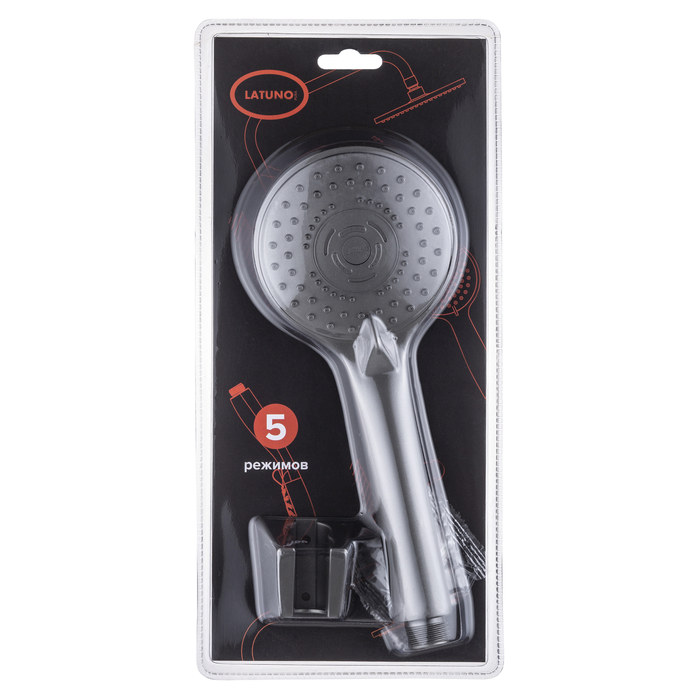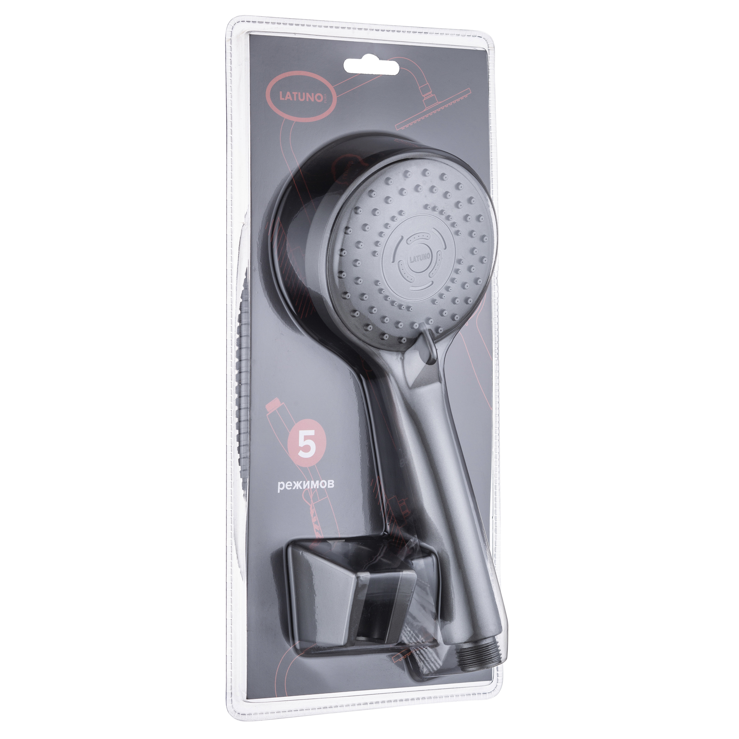 Российская торговая марка Pura Latuno это - смесители и душевые системы, разработанные согласно всем требованиям российских эксплуатационных условий. Душевой набор: лейка пятирежимная, 87 мм с самоочищающимися форсунками,шланг металлический 1,5 м, цвет: графит