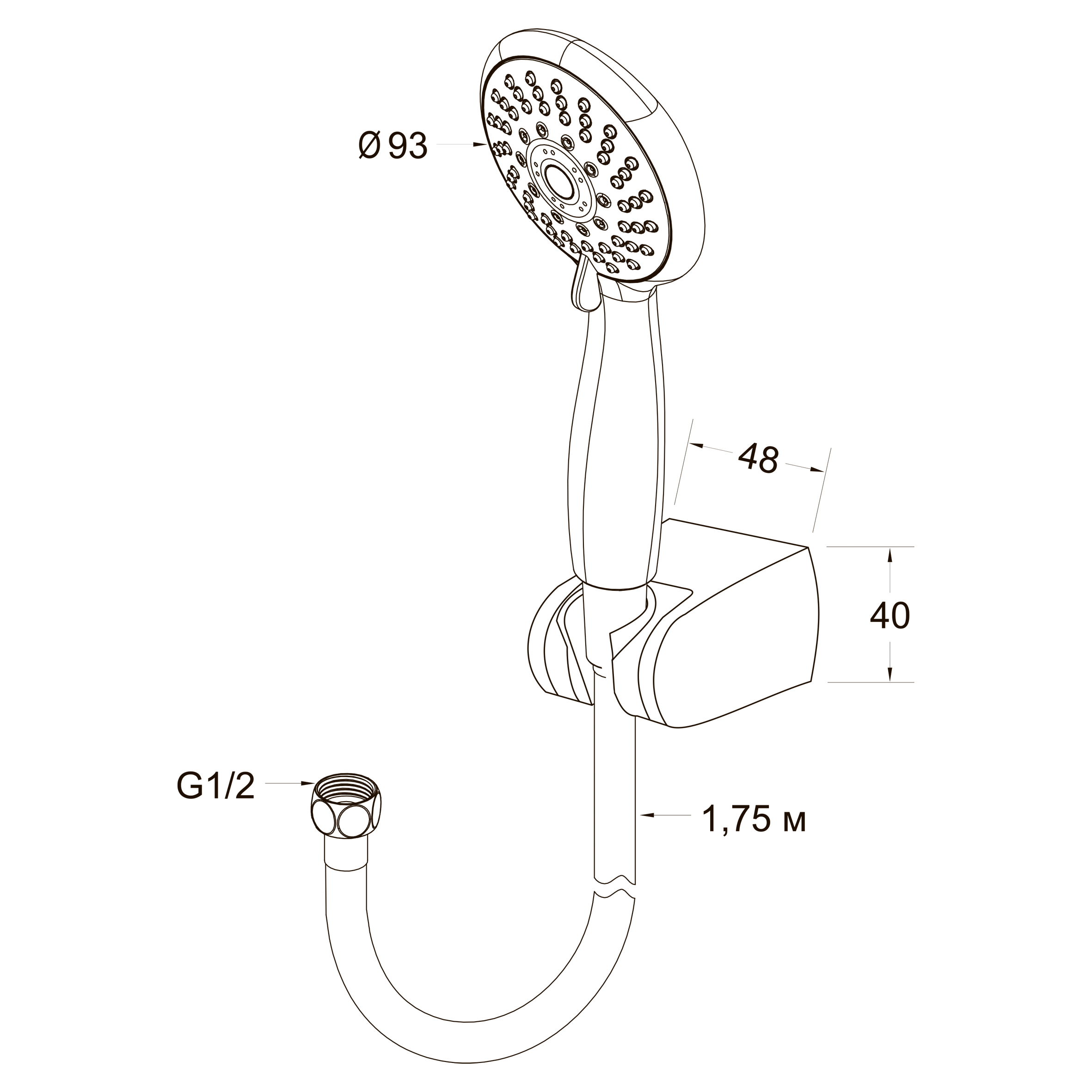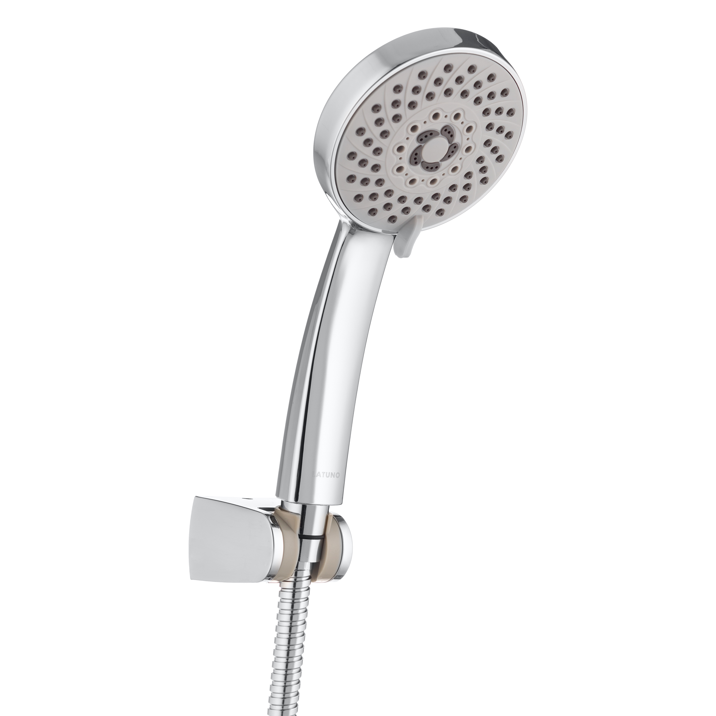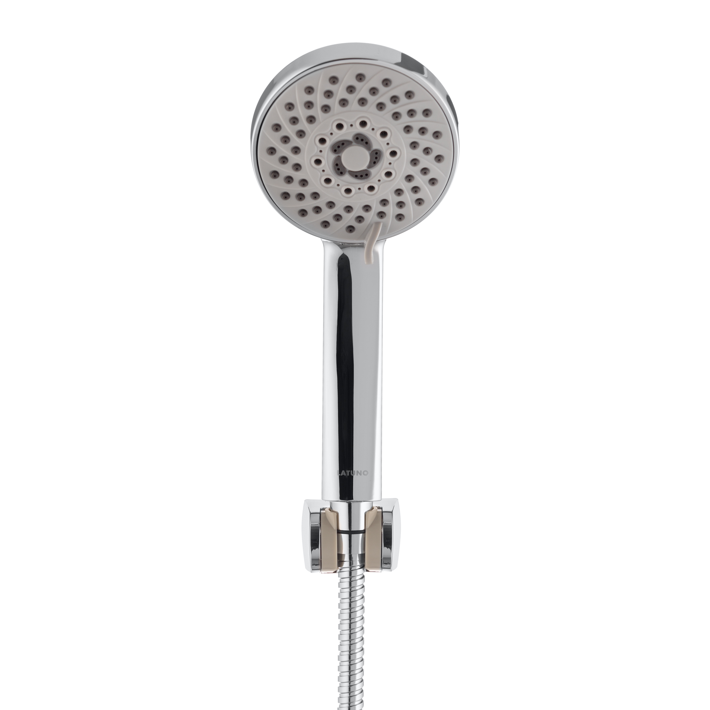 Российская торговая марка Pura Latuno это - смесители и душевые системы, разработанные согласно всем требованиям российских эксплуатационных условий. Душевой набор: лейка пятирежимная 93 мм с самоочищающимися форсунками, шланг металлический 1,75 м, держатель из хромированного ABS-пластика.