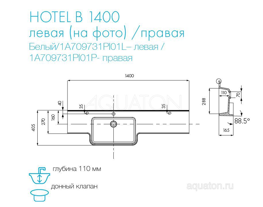 1A709731PI01P Раковина Aquaton Hotel B 140 правая белая 1A709731PI01P