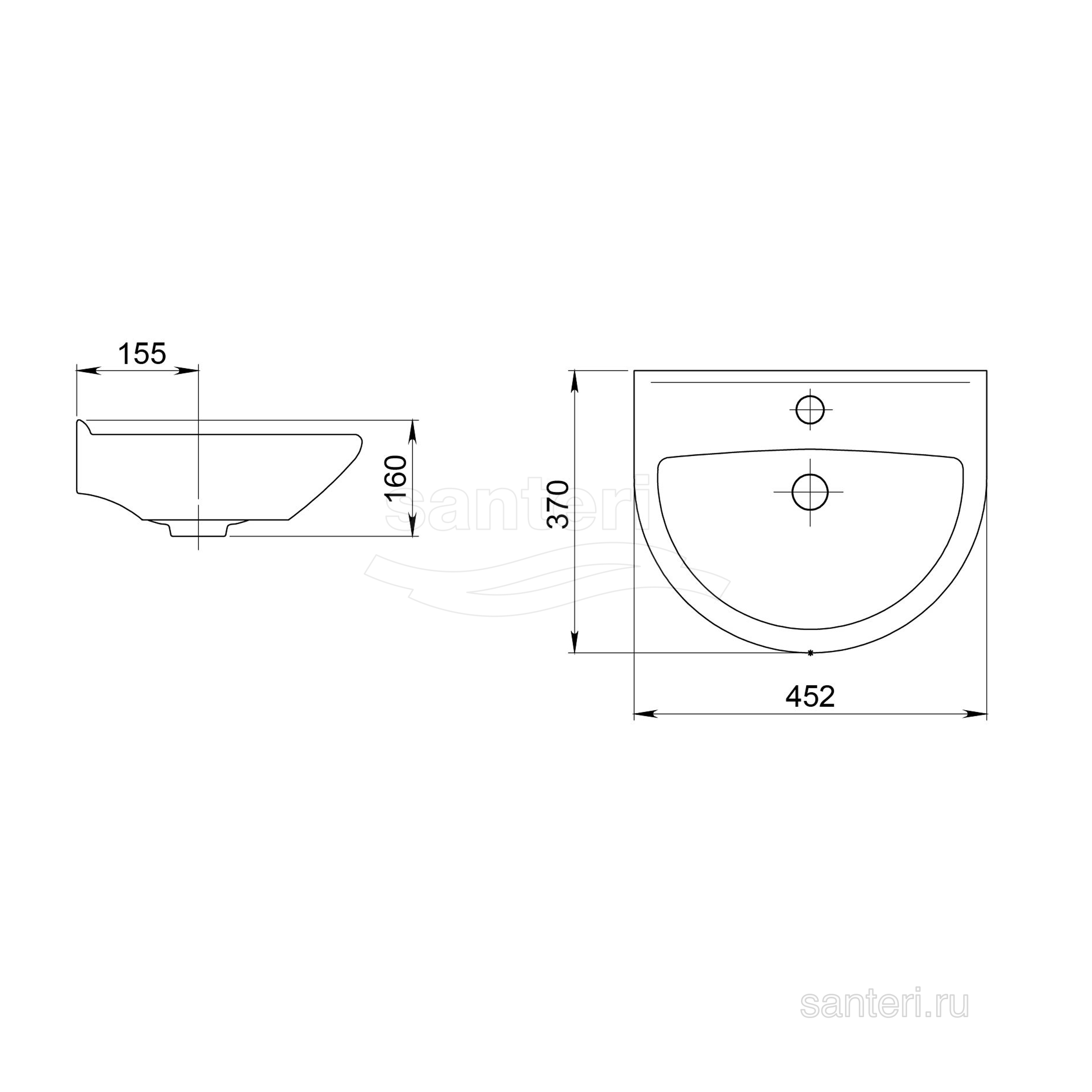 Раковина. Без отверстия перелива, с отверстием для смесителя