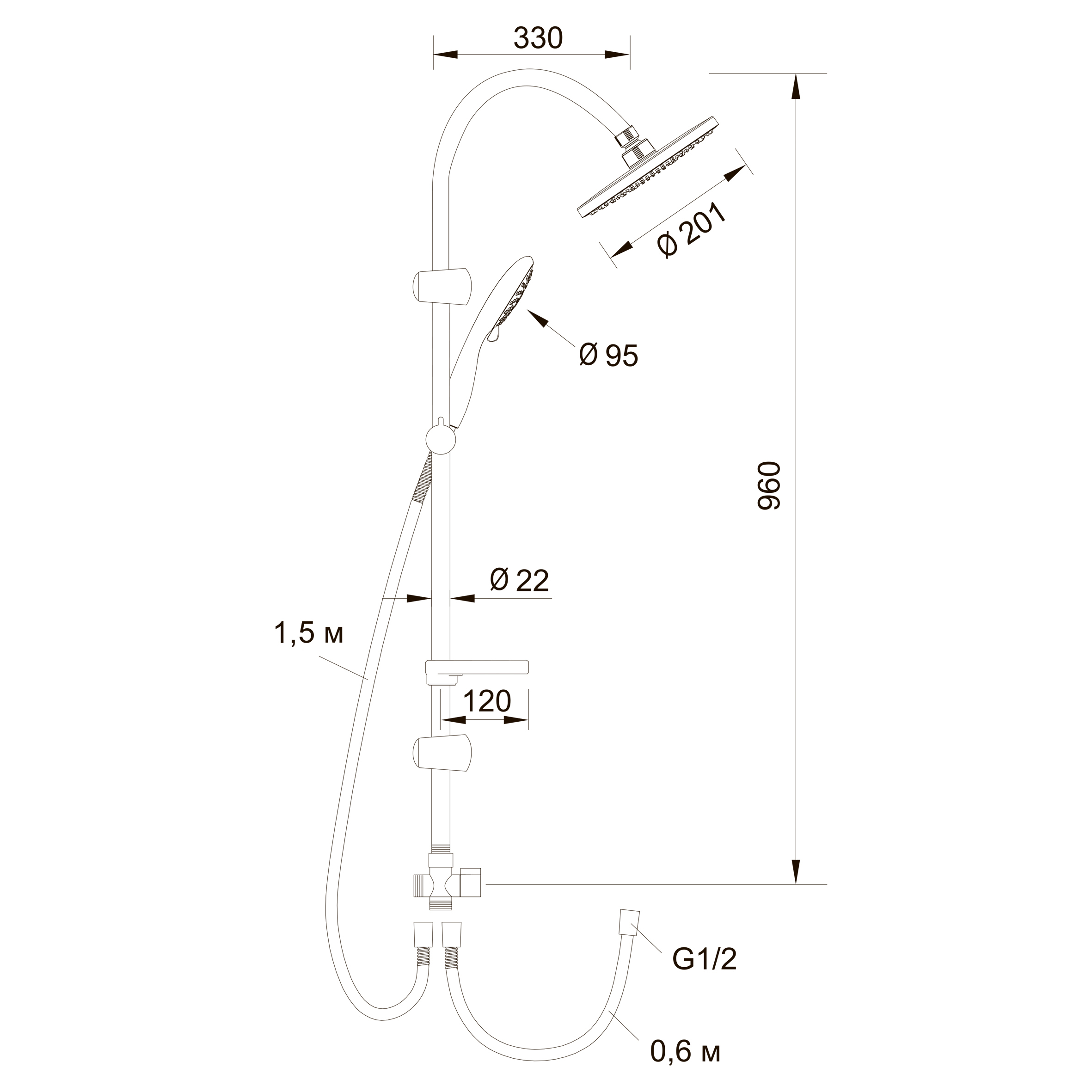 штанга, верхняя душевая головка, душевая лейка, шланги, мыльница, держатель для лейки, крепления
