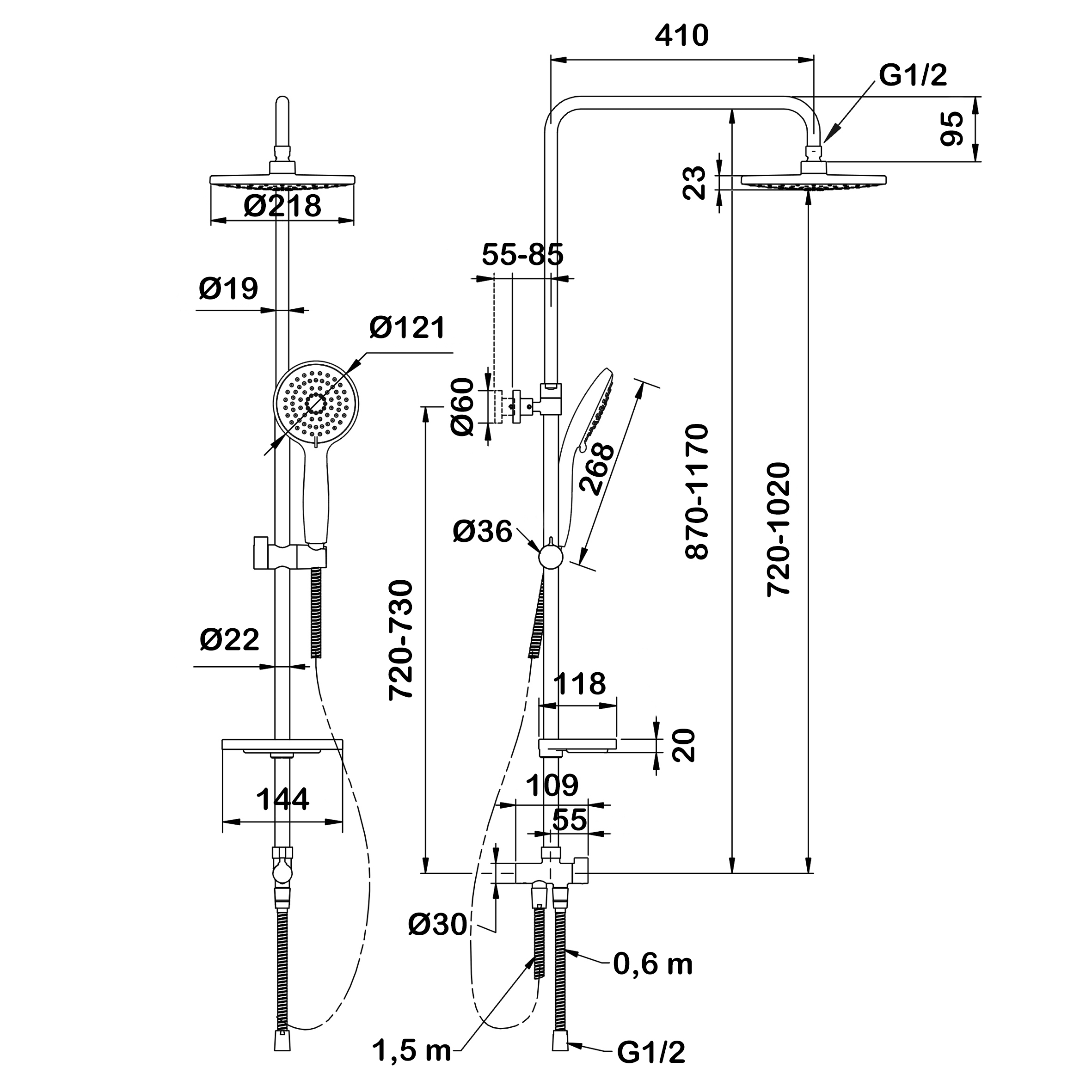 Тропический душ. Верхний душ с функцией экономии воды, расход  14 л/мин - 220 мм. Система подмеса воздуха Air-in, металл. Латунный узел регулировки наклона. Латунные трубки с возможностью регулировки высоты. Ручной душ 3 режима - 120 мм. 3D-эффект. Мыльница. Металлический шланг 1,5 и 0,6 мм. для подключения к любому смесителю, с системой против скручивания. Латунный дивертер.