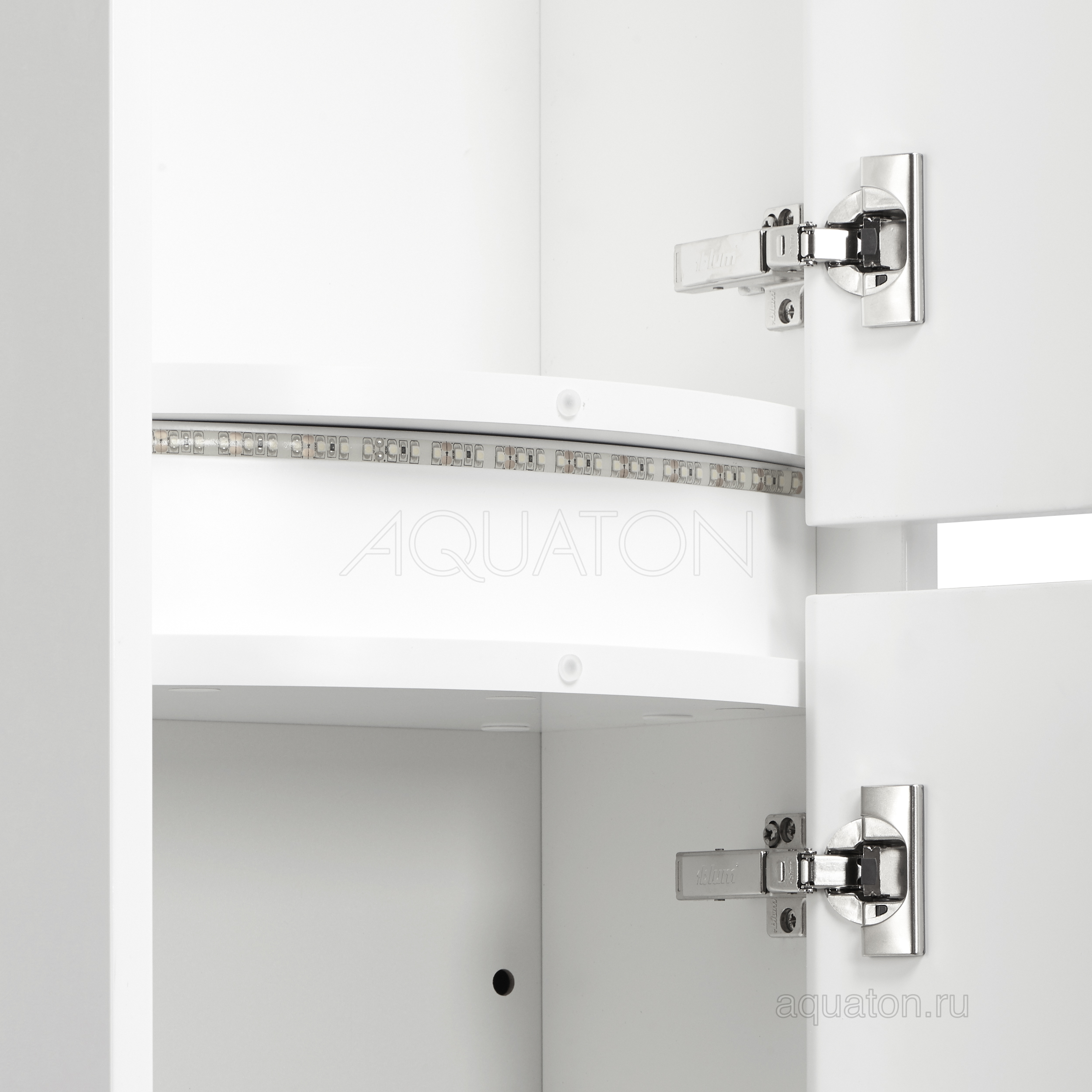 Подвесной шкаф-колонна Астера оснащен встроенной LED-подсветкой, которая подключается к общей сети электропитания в ванной комнате. Изогнутые фасады безупречно окрашены с обеих сторон в белый глянец. Отсутствие лицевой фурнитуры позволяет вписать мебель практически в любой интерьер и делают ее еще более удобной. Петли с интегрированным механизмом плавного довода с системой Blumotion австрийского производителя BLUM гарантируют безупречную работу и длительный срок службы. Петли этой модели расположены справа.