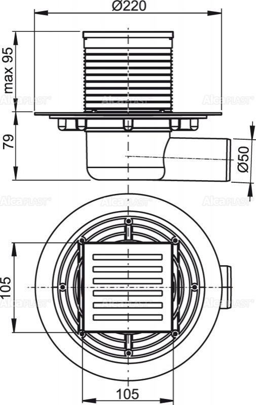 - Боковое подключение к канализационному стоку x50 мм;