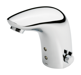 Смеситель изготовлен из материала-латунь, цвет покрытия хром. Способ монтажа горизонтальный. Гибкая подводка. Бесконтактный смеситель для умывальника с рукояткой регулировки температуры. Смеситель может быть легко модифицирован для работы без рукоятки регулировки температуры для использования предварительно смешанной воды. Работает от батарейки 6 В. Оснащен грязевыми фильтрами и обратными клапанами. При установке не требуется настройка параметров- используется улучшенный датчик с системой автофокуса. Клапан с импульсным управлением обеспечивает длительный срок службы батареи. Ограничитель расхода (6 л/м) уменьшает потребление воды (0.5 л/ включение).