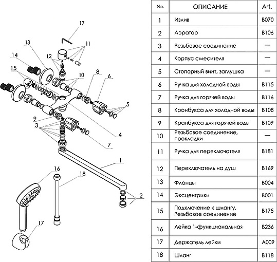 эксцентрики, настенный держатель, душевой шланг, душевая лейка, аэратор, переключатель потоков