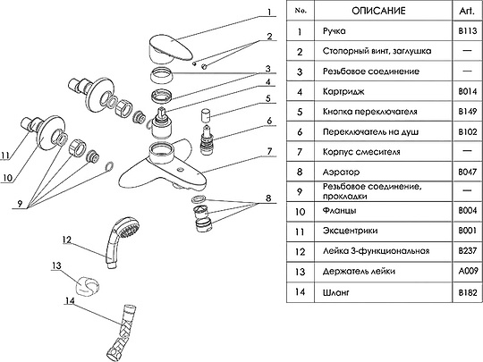 эксцентрики, настенный держатель, душевой шланг, душевая лейка, аэратор, переключатель потоков