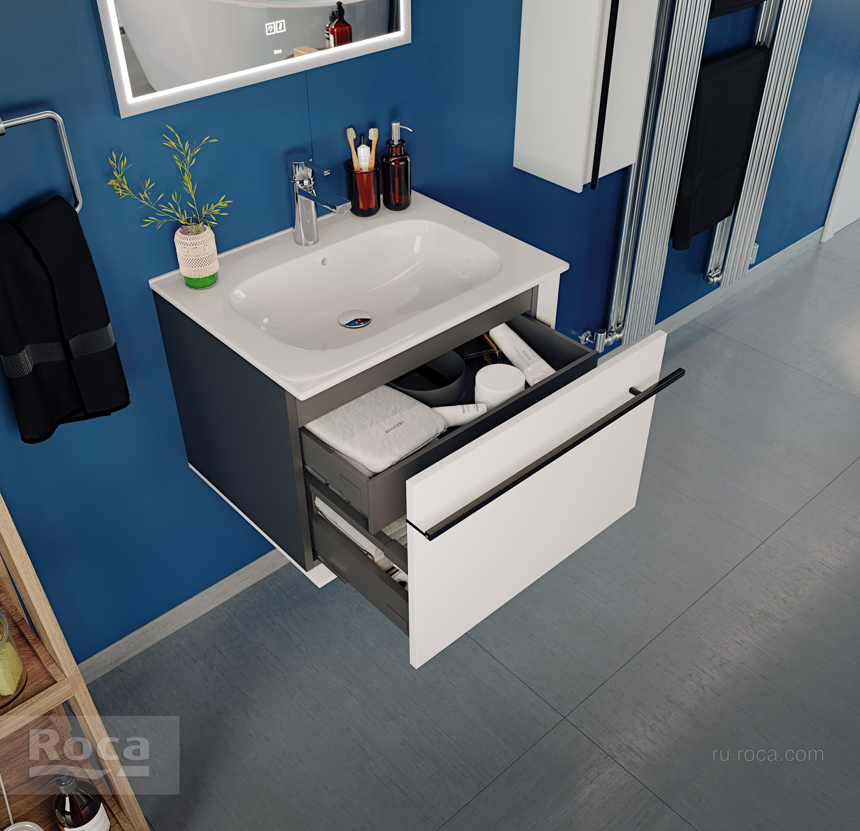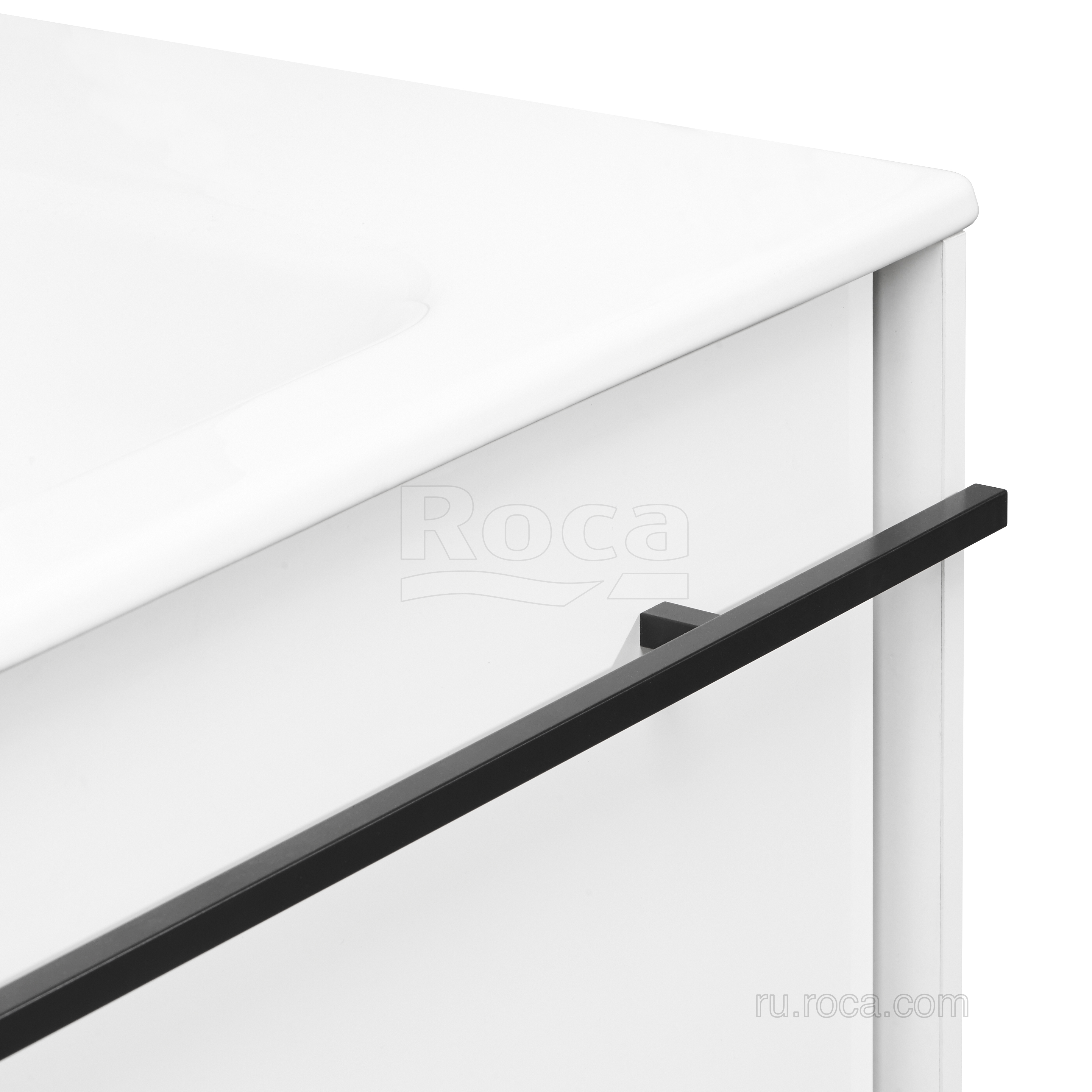 Четкая геометрия линий, сдержанность и широкий функционал – три определения, которые лучше всего описывают коллекцию Aneto. Фасад модуля Aneto размера 600 мм выполнен из MDF,  окрашенной в белоснежный глянец, а корпус и левая боковая стенка  – из влагостойкой ламинированной плиты в черном цвете. За фасадом находится небольшой внутренний ящик, открывающийся  с помощью системы push-to-open и идеально подходящий для хранения небольших мелочей. Вместительный внешний ящик позволит разместить более крупные предметы. Тонкая и изящная ручка в черном матовом цвете подчеркивает графичность дизайна коллекции и может использоваться  как полотенцедержатель. Модуль комплектуется керамической раковиной Roca Victoria-N.